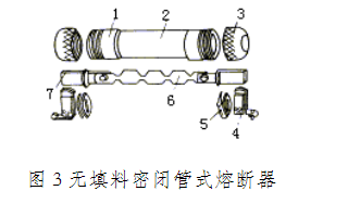 (3)封閉式熔斷器 封閉式熔斷器分有填料熔斷器和無填料熔斷器兩種,如圖3和圖4所示。有填料熔斷器一般用方形瓷管,內(nèi)裝石英砂及熔體,分斷能力強,用于電壓等級500V以下、電流等級1KA以下的電路中。無填料密閉式熔斷器將熔體裝入密閉式圓筒中,分斷能力稍小,用于500V以下,600A以下電力網(wǎng)或配電設(shè)備中。