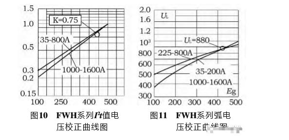8)當系統(tǒng)電壓為420V時,查閱圖11FWH系列弧電壓校正曲線圖,可得最大弧電壓為880V。