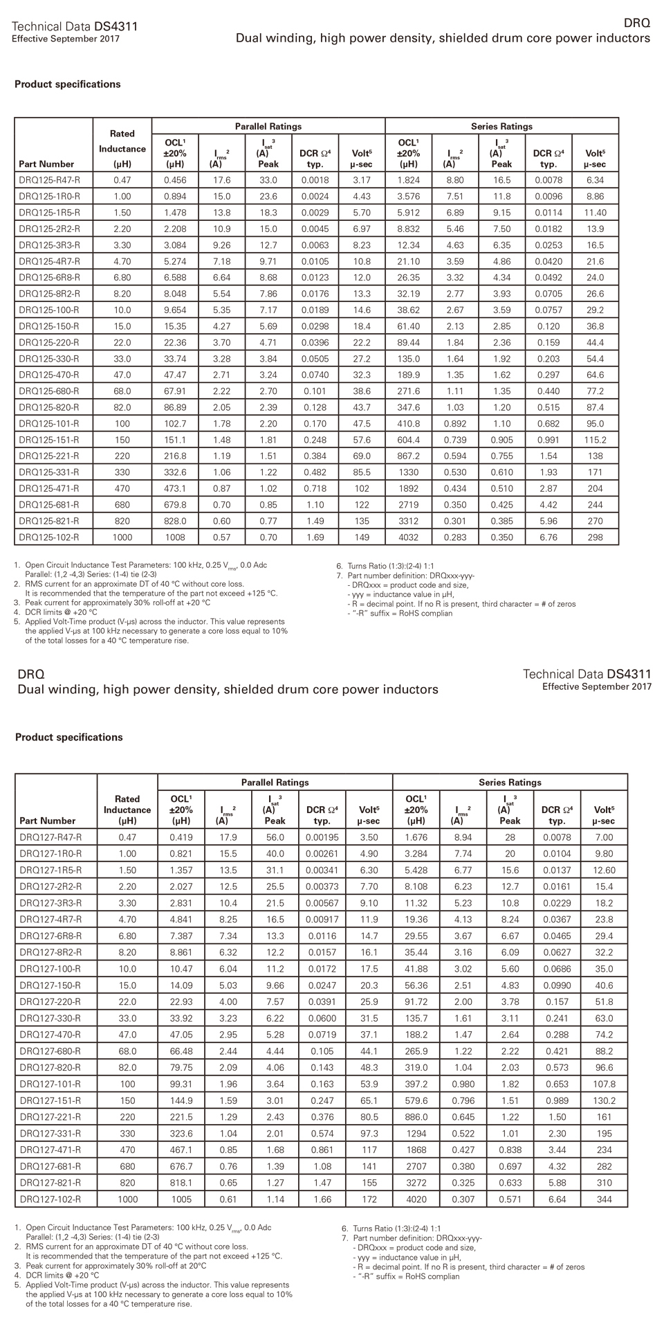 SMD 雙繞組屏蔽式功率電感器 - DRQ 系列,DRQ 系列雙繞組電感器,用于單電感器或耦合電感器應(yīng)用(1:1 匝數(shù)比)。 DRQ 電感器提供多種電感和電流額定值,因?yàn)樗鼈兛纱?lián)或并聯(lián)連接。 設(shè)計(jì)采用具有 125&deg;C 最高工作溫度的鐵氧體磁芯 DRQ 系列。DRQ 系列的應(yīng)用包括:用作變壓器 - SEPIC、回掃;用作電感器 - 降壓、升壓耦合;直流-直流轉(zhuǎn)換器;VRM 電感器,用于 CPU 和 DDR 電源,輸入和輸出濾波器扼流圈
